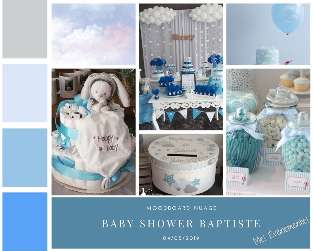 Eh bien, un moodboard, ou planche d’inspiration, c’est un tableau où l’on met tout ce qui nous inspire. Super, on est bien avancés avec ça, me direz-vous ! Mais concrètement, c’est quoi ? C’est une sorte de montage ou de collage où l’on peut mettre toutes sortes de choses : des couleurs, des textures, des photos ou encore des dessins de choses en particulier ou d’idées plus générales. Dans le cadre d’un événement, le but est de donner le fil conducteur de l’événement. Sur mes moodboards, vous trouverez toujours une photo de nature qui m’inspire l’ambiance (ou le thème, comme vous voulez, mais je préfère parler d’ambiance) de l’événement. Par exemple, pour le moodboard de la Baby Shower du petit Baptiste sur l’ambiance « Nuage », vous trouverez une photo de nuage, tout simplement.